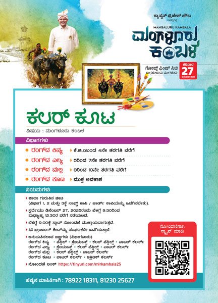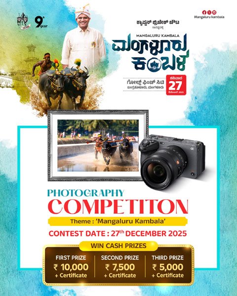 ಫೋಟೊಗ್ರಾಫಿ ಸ್ಪರ್ಧೆ: ಮಂಗಳೂರು ಕಂಬಳ ಫೋಟೊಗ್ರಾಫಿ ಸ್ಪರ್ಧೆಗೆ ನಗದು ಬಹುಮಾನ ನೀಡಲಾಗುವುದು.